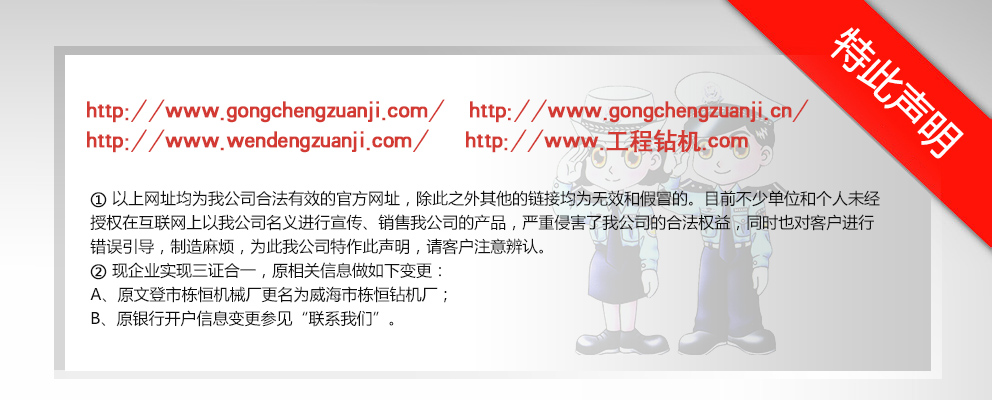 威海市棟恒鉆機(jī)廠隸屬于文登市工程鉆機(jī)廠,主要生產(chǎn)、銷售工程鉆機(jī)。它坐落于文登市西鋪頭工業(yè)園,這里科技發(fā)達(dá),交通便利,制造業(yè)集中。 自1982年建廠以來,經(jīng)過多年的優(yōu)化改革和沉淀積累,擁有精密、大型加工設(shè)備近百臺(tái)的生產(chǎn)企業(yè)之一。現(xiàn)在研制成功的GJ-400、GJ-250S、GJ-250A、GJ-240S、GJ-240A、GJ-180S、GJ-180A型等鉆機(jī)。在其它產(chǎn)品上,企業(yè)建立了長(zhǎng)期、中期、短期的發(fā)展規(guī)劃,一系列的高性能產(chǎn)品正在不斷推出中,企業(yè)應(yīng)市場(chǎng)需求對(duì)系列產(chǎn)品進(jìn)行了優(yōu)化組合,開發(fā)了與之對(duì)應(yīng)配套的三腿、四腿單天車輪、雙天車輪鉆塔;泥漿泵—BW-160Q、BW- 200Q型球形閥泥漿泵大大提高了泵的使用性能和機(jī)械效率
